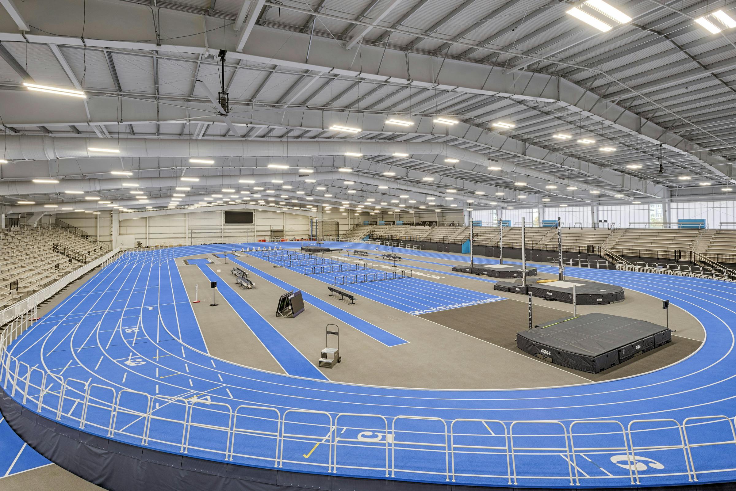 The core programmatic component of the venue is a 200-meter hydraulically banked indoor track, the first of its kind in the United States, built to NCAA Division I specifications with the express goal of attracting NCAA National Championships. Eight sprint lanes, dedicated field event zones, and a reconfigurable infield allow the space to transition between multiple formats, with seating for over 5,000 spectators. The surface converts for basketball, volleyball, wrestling, and cheer, enabling efficient scheduling while preserving a high-caliber athlete experience.