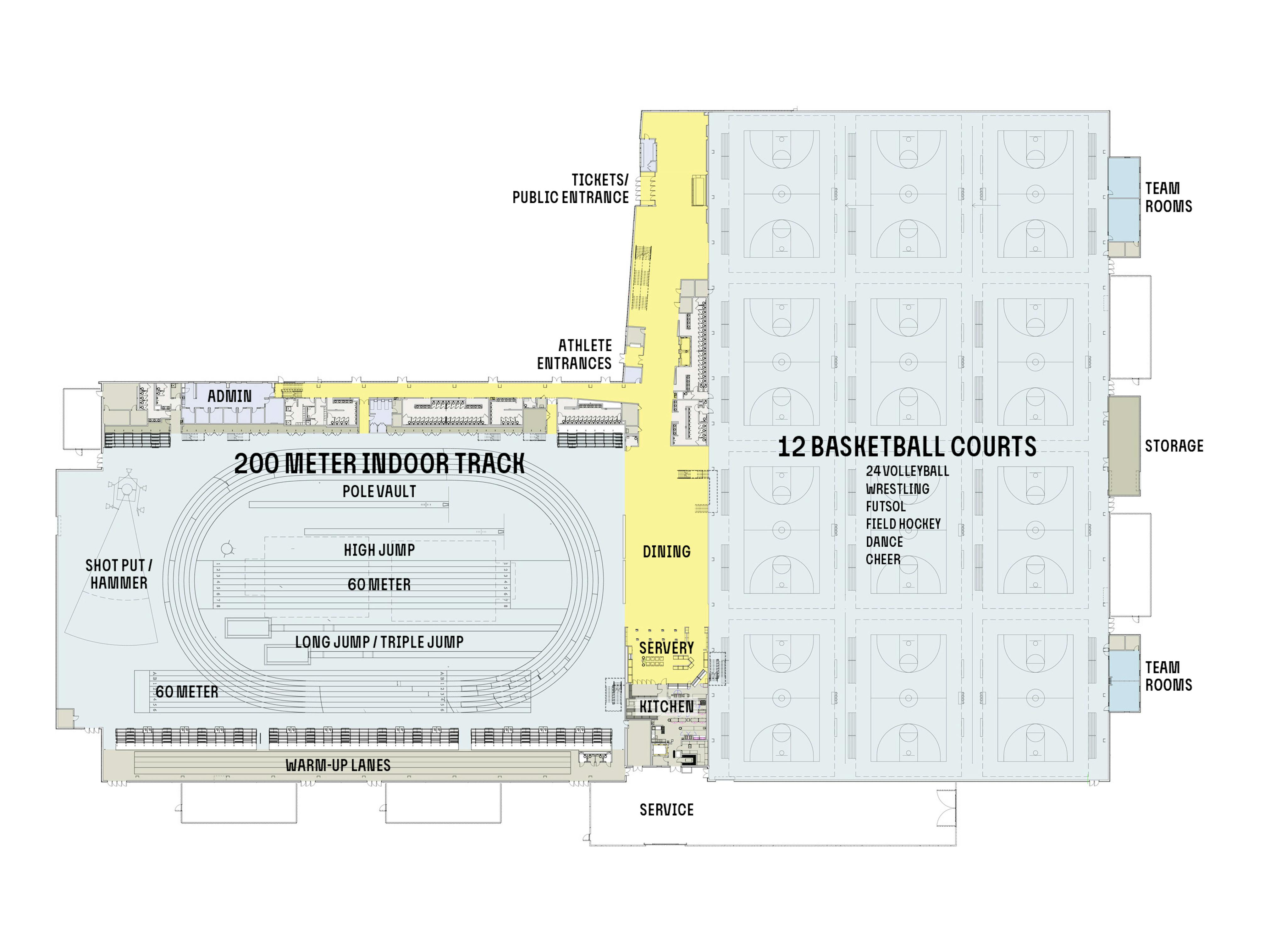 Twelve hardwood basketball courts, convertible into 24 volleyball courts, define the primary court zone. Mezzanine-level concessions and viewing platforms offer uninterrupted sightlines, and circulation paths for athletes, officials, and spectators minimize congestion and support efficient event turnover.