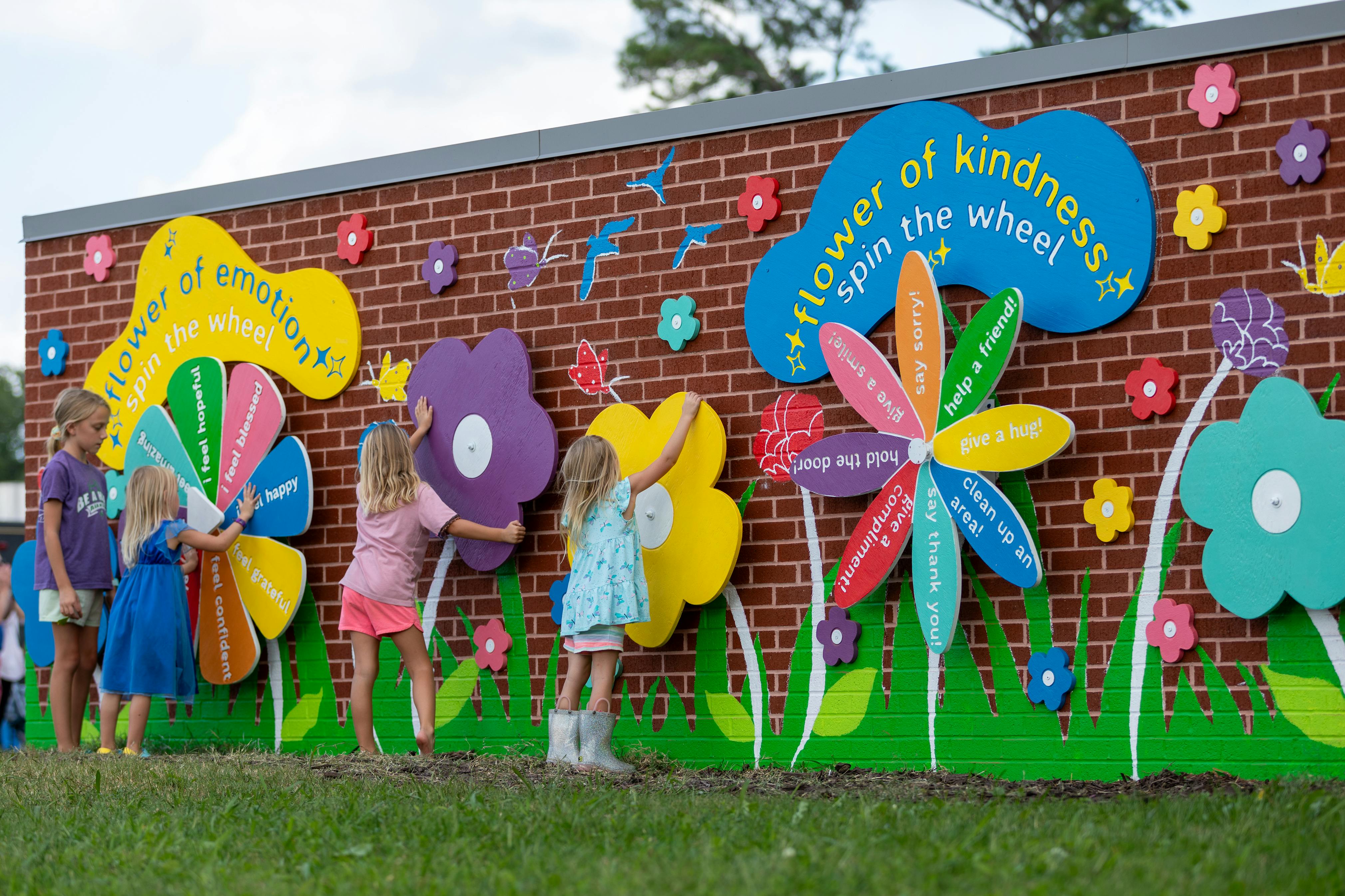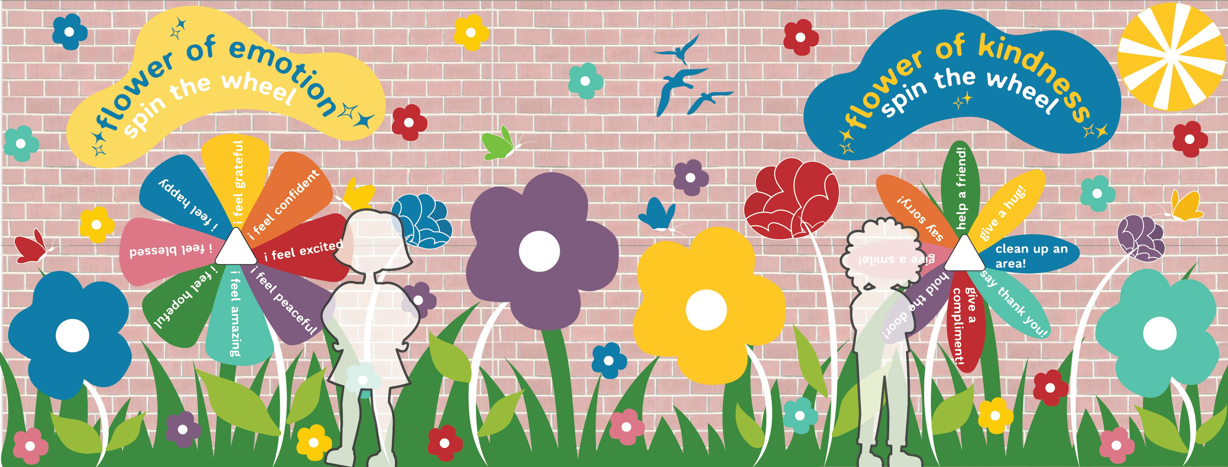 The wall's two main features are the "Flower of Emotion," an interactive spin wheel that helps kids learn about expressing their feelings, and the "Flower of Kindness," a value-driven game that teaches the importance of kindness. These focal points are surrounded by smaller spin-able, playable flowers, forming a lively mural that includes butterflies, abstract clouds, and a sun, making the wall come alive with engaging activities. The adjacent sidewalk also features playful games to enhance the experience for kids, visitors, and the community upon arrival.