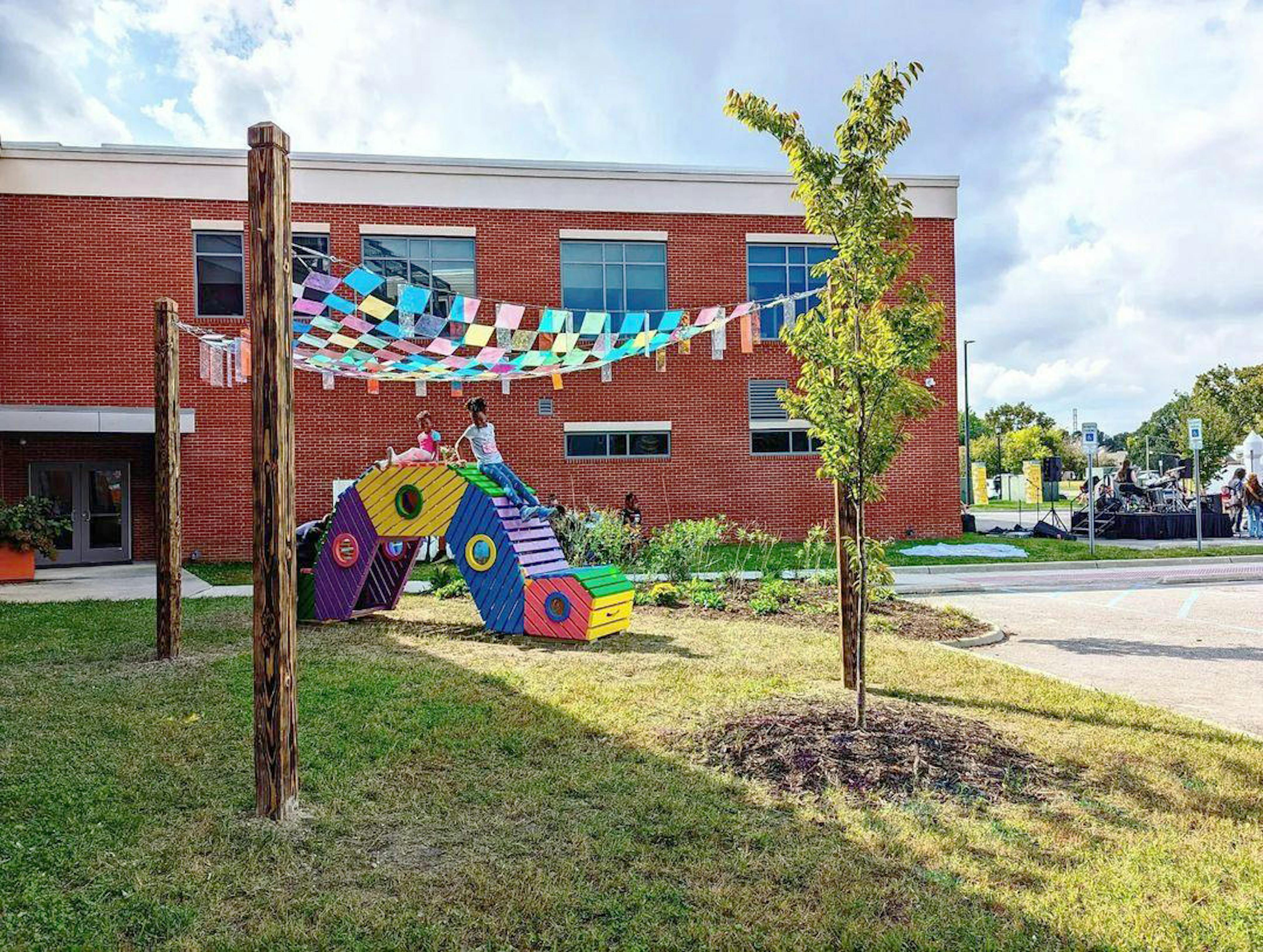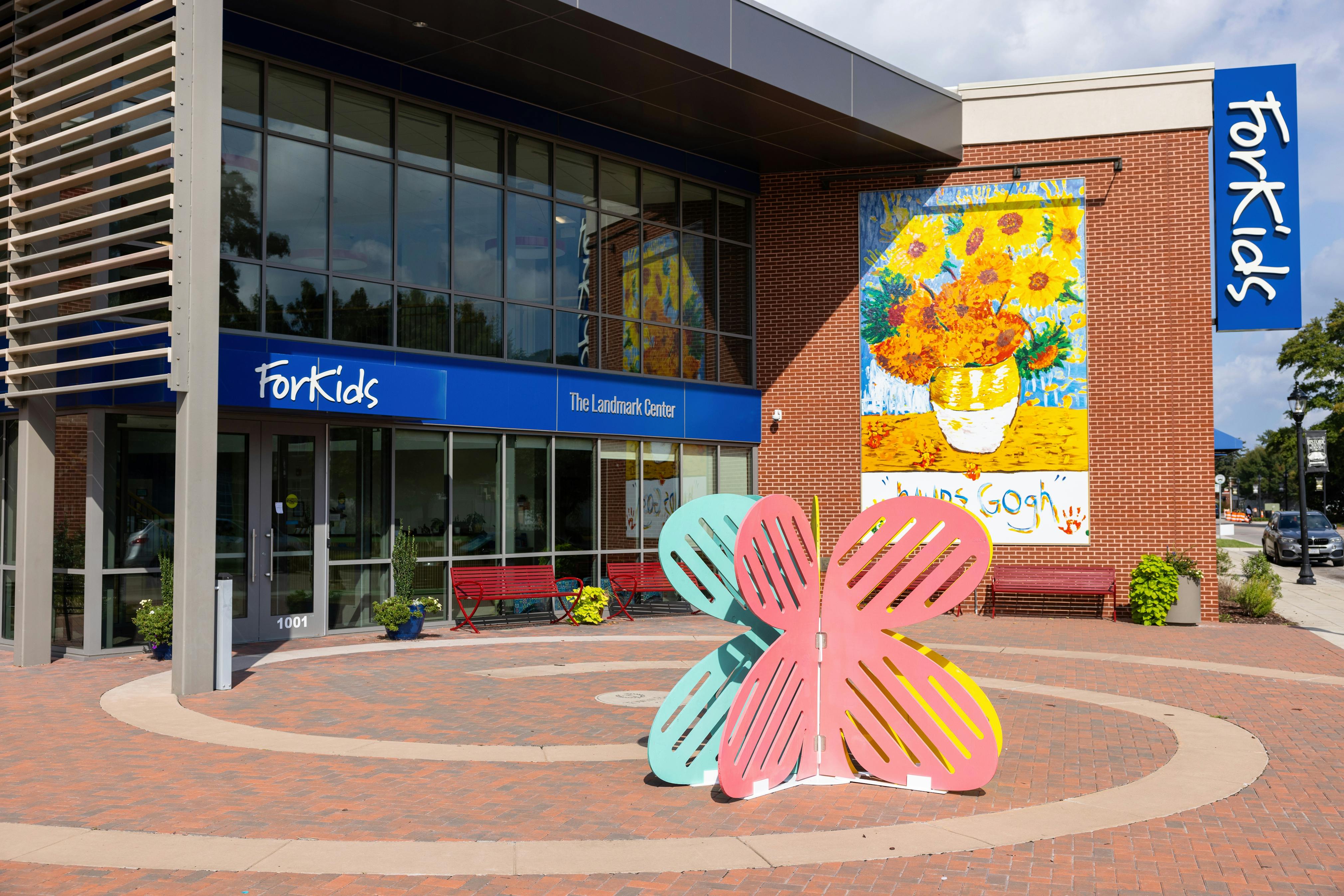 Located on the front plaza of ForKids, the Butterfly sculpture greets visitors as they arrive, serving as a vibrant introduction to the Pop-Up Park. Its bold colors ensure that it captures attention not only as you approach the building, but from Poindexter St. as well. Additionally, tan pavers weave through the brick pattern of the plaza, guiding pedestrians from the sidewalk to the entrance. Intentionally positioned along these pathways, the Butterfly interacts cohesively with the surrounding hardscape, creating an inviting atmosphere that draws you in.