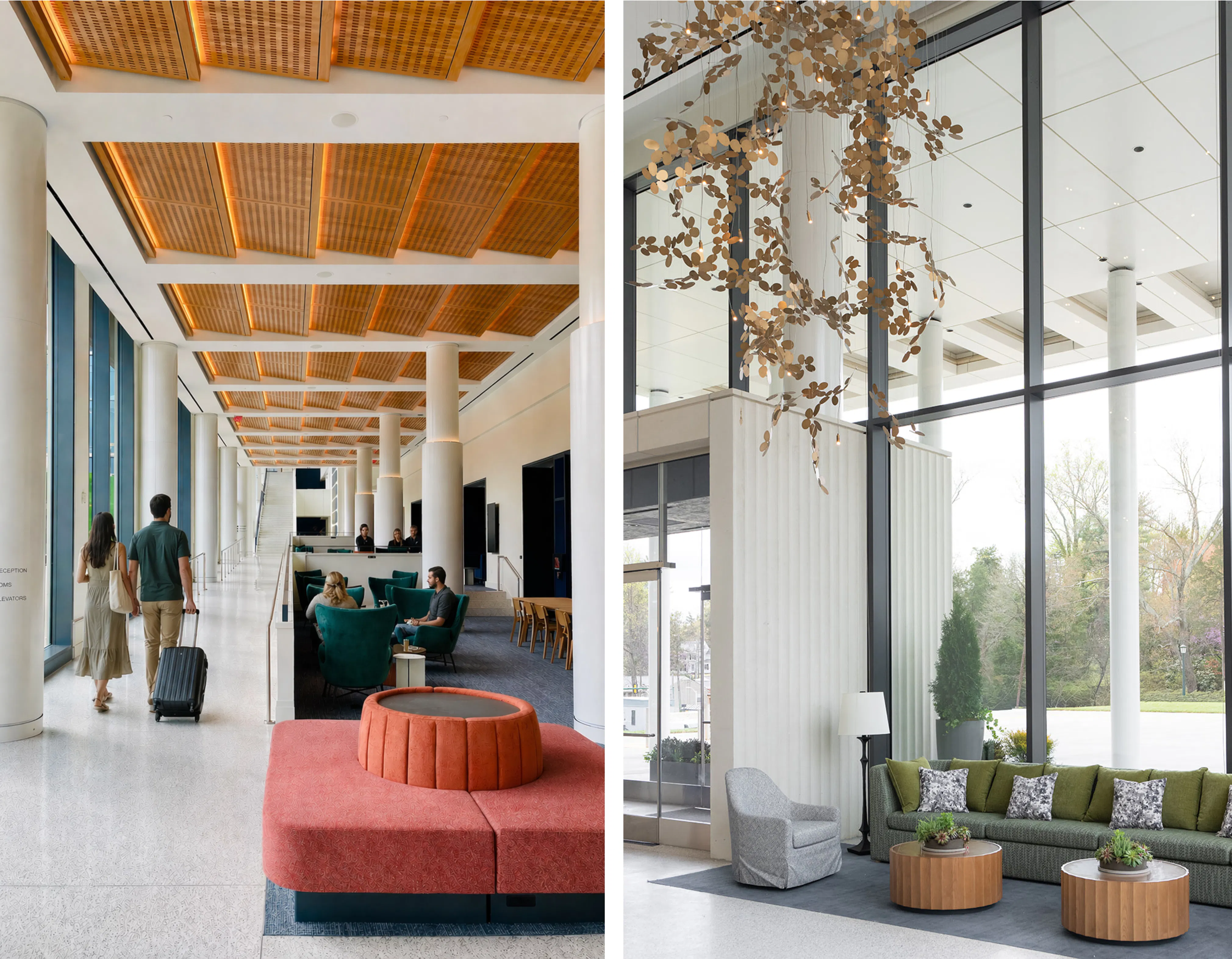 The Virginia Guesthouse at the University of Virginia offers another reading where hospitality is less about retreat from context than about connection within it. Sited at the hinge between Central and North Grounds, the 214-room hotel anchors the Emmet-Ivy Corridor and serves as both threshold and commons, pulling together a hotel, conference center, visitor hub, and social condenser in a single building.