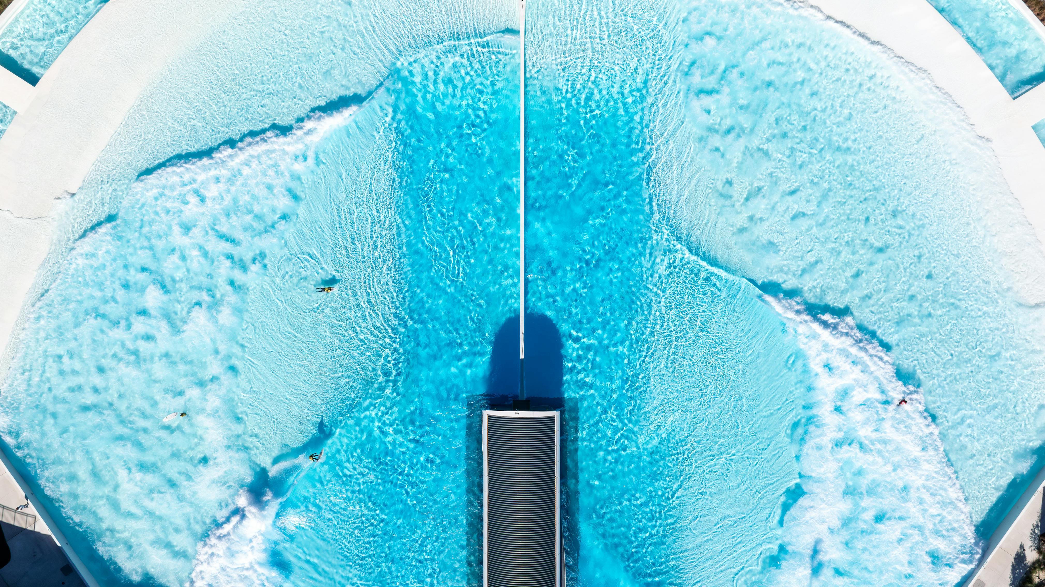 Circulation was reimagined vertically: an upper promenade for shopping and slow movement, and a lower path that runs along the lagoon’s edge, placing pedestrians eye-level with the surf. The lagoon was sunk deeper than originally planned, creating a stadium-like effect that draws the public into the experience without requiring entry.