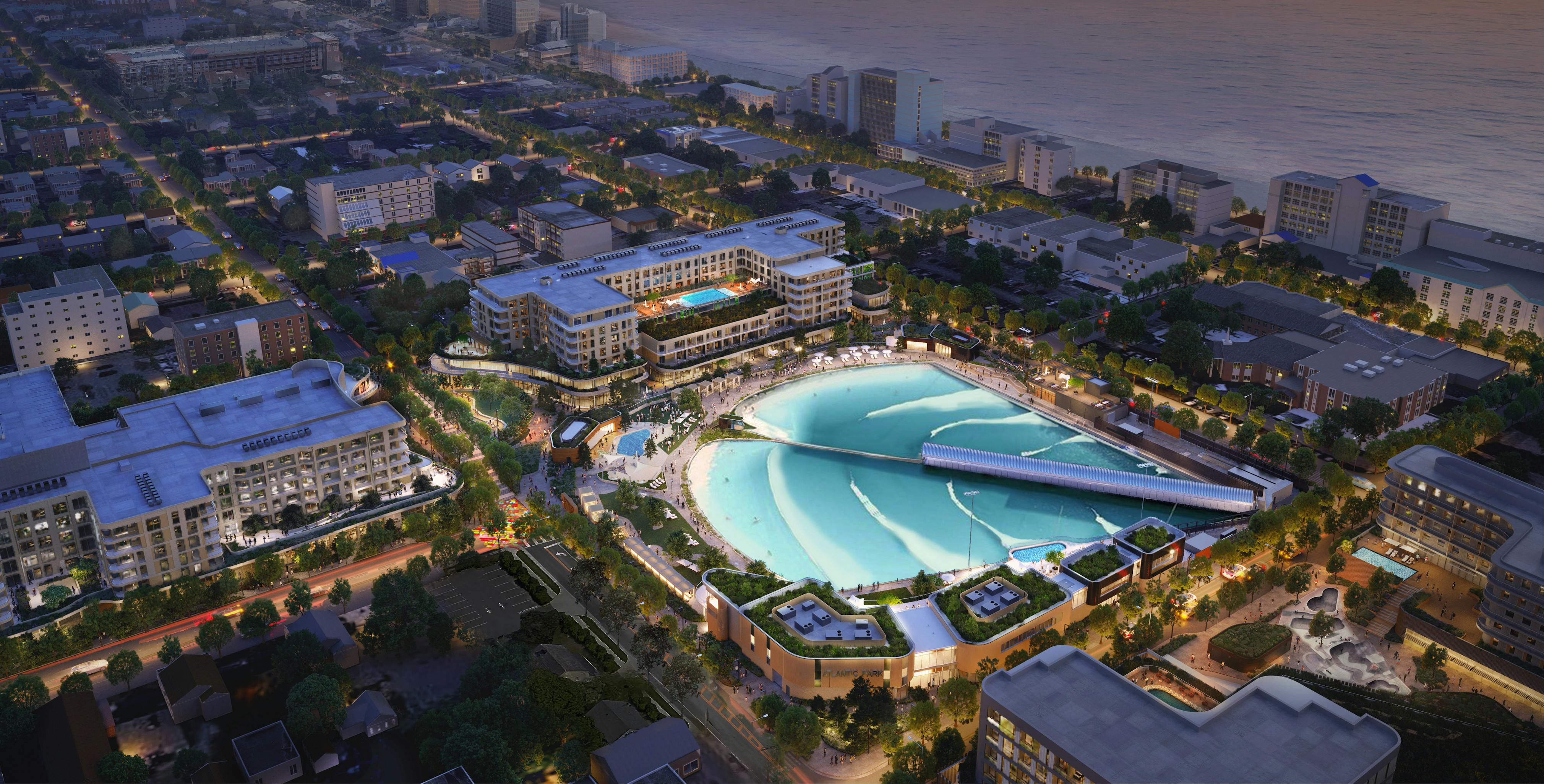 On any given evening, light breaks differently across Atlantic Park. Set between the ViBe District and the boardwalk, its edges are alive with contradiction: surfers threading engineered barrels surrounded by street-level terraces, locals pausing mid-stride to watch the waves roll in, glass-fronted restaurants framing it all like living dioramas.