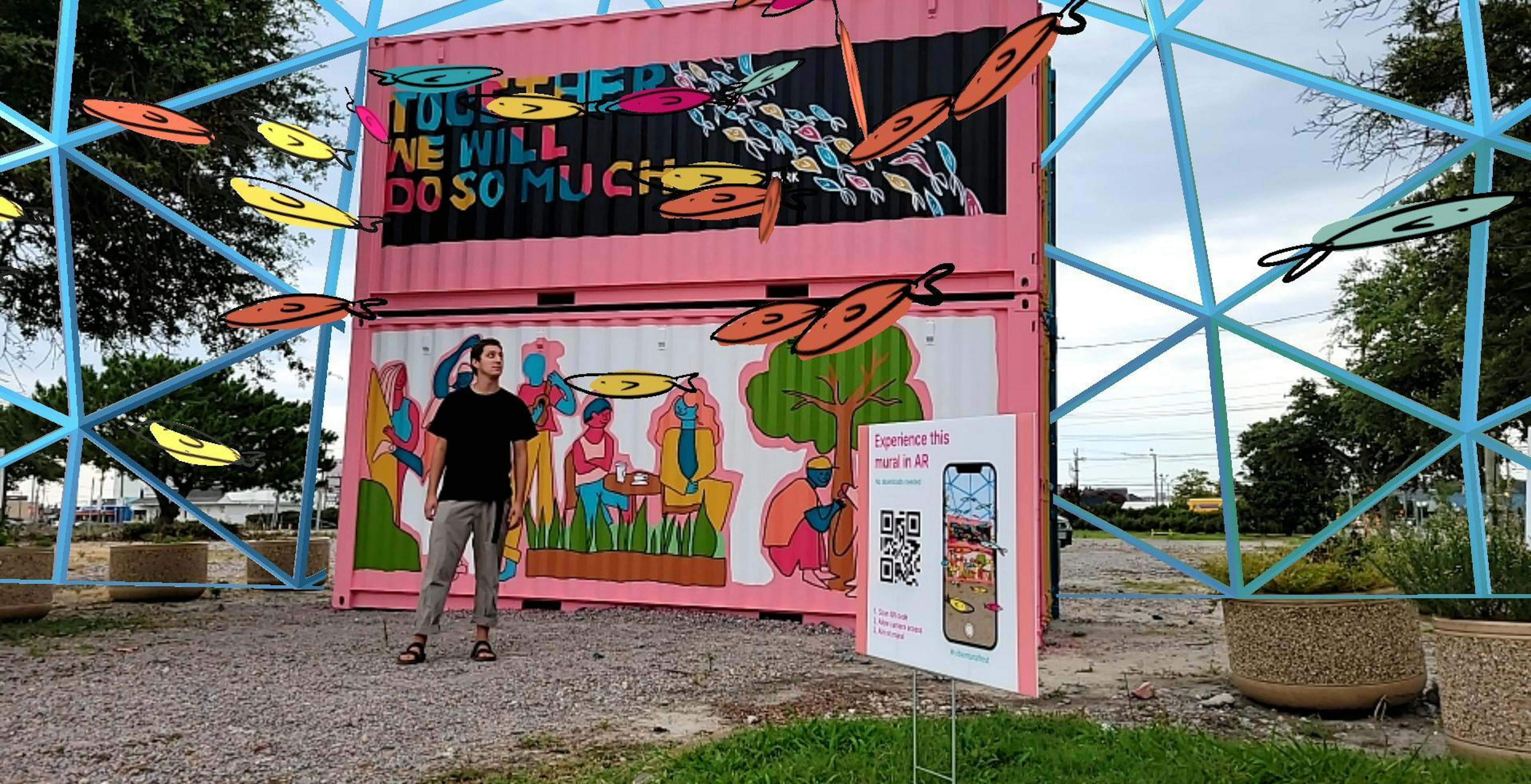 Before construction began, the site joined the annual mural festival with local artist Hannah Kirby painting stacked shipping containers as a temporary canvas layered with augmented reality curated by ‘Orange Juice’ at Hanbury.