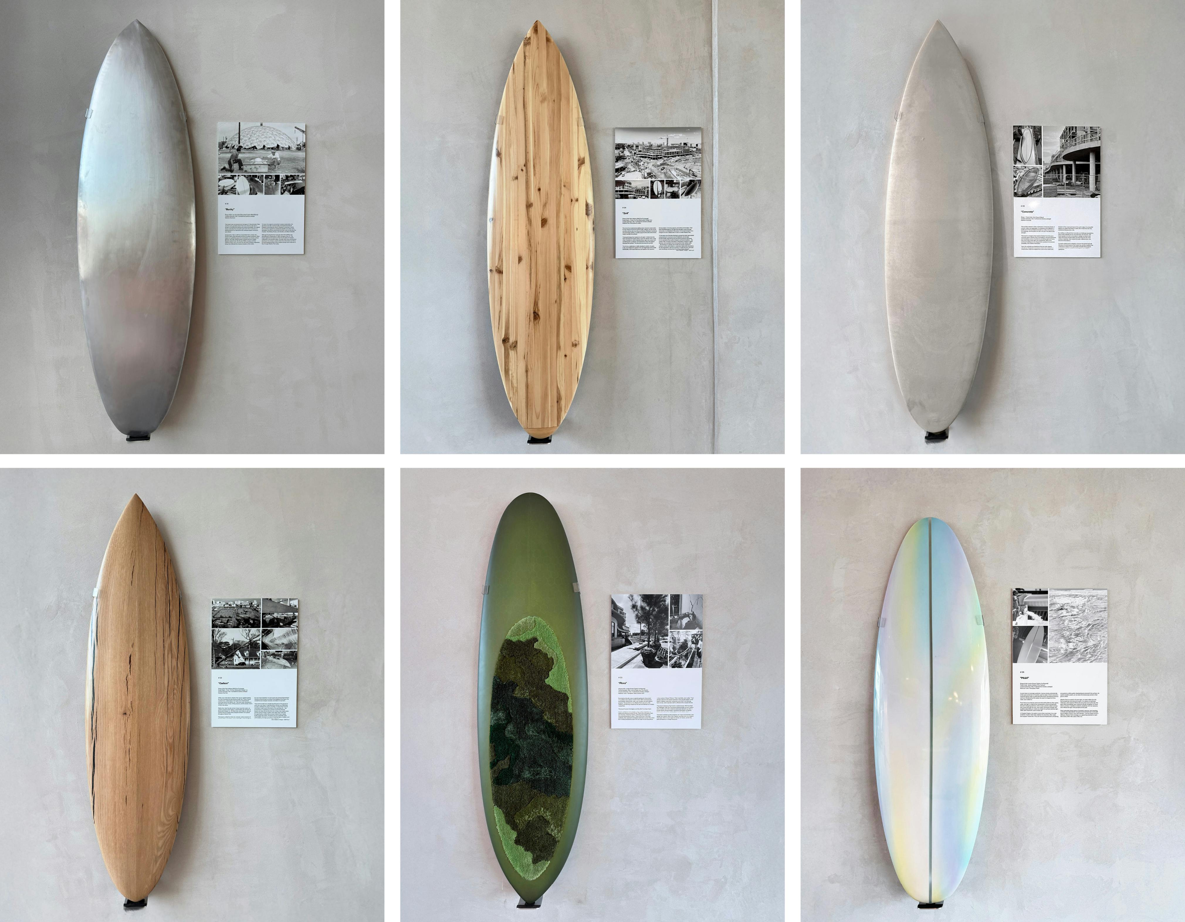 In the Atlantic Park Surf building lobby, a wall of commissioned surfboards by local shapers forms a sculptural narrative of craft. Metalwork by Joe Alexander, wood-work by Nick Halleran and Pat Ryan, polished concrete by Zach Peace of Hâpax, custom shaping by Jordan Brazie, tufting by Nikki Leone, and finish work by Bang Art and James Coleson.