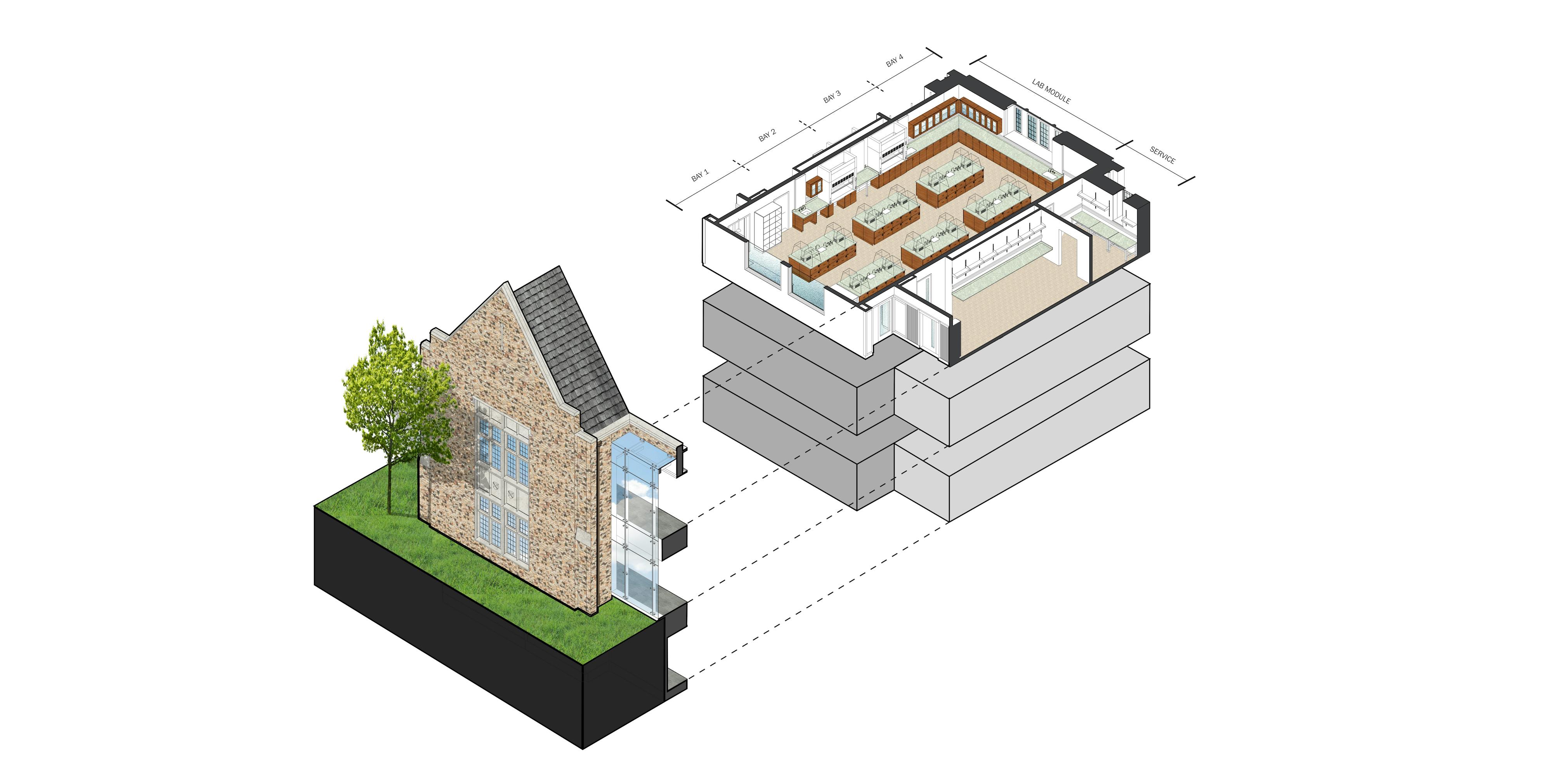 The design introduces transparency and daylight, a departure from the traditional Collegiate Gothic architecture of the campus. The integration of stone structures and glass elements creates a balanced composition, blending form and function. The gable forms, consistent with the historic campus aesthetic, house classrooms, labs, and research facilities. Meanwhile, the glass hyphens encourage connections and dialogue among students and faculty while providing abundant natural light.