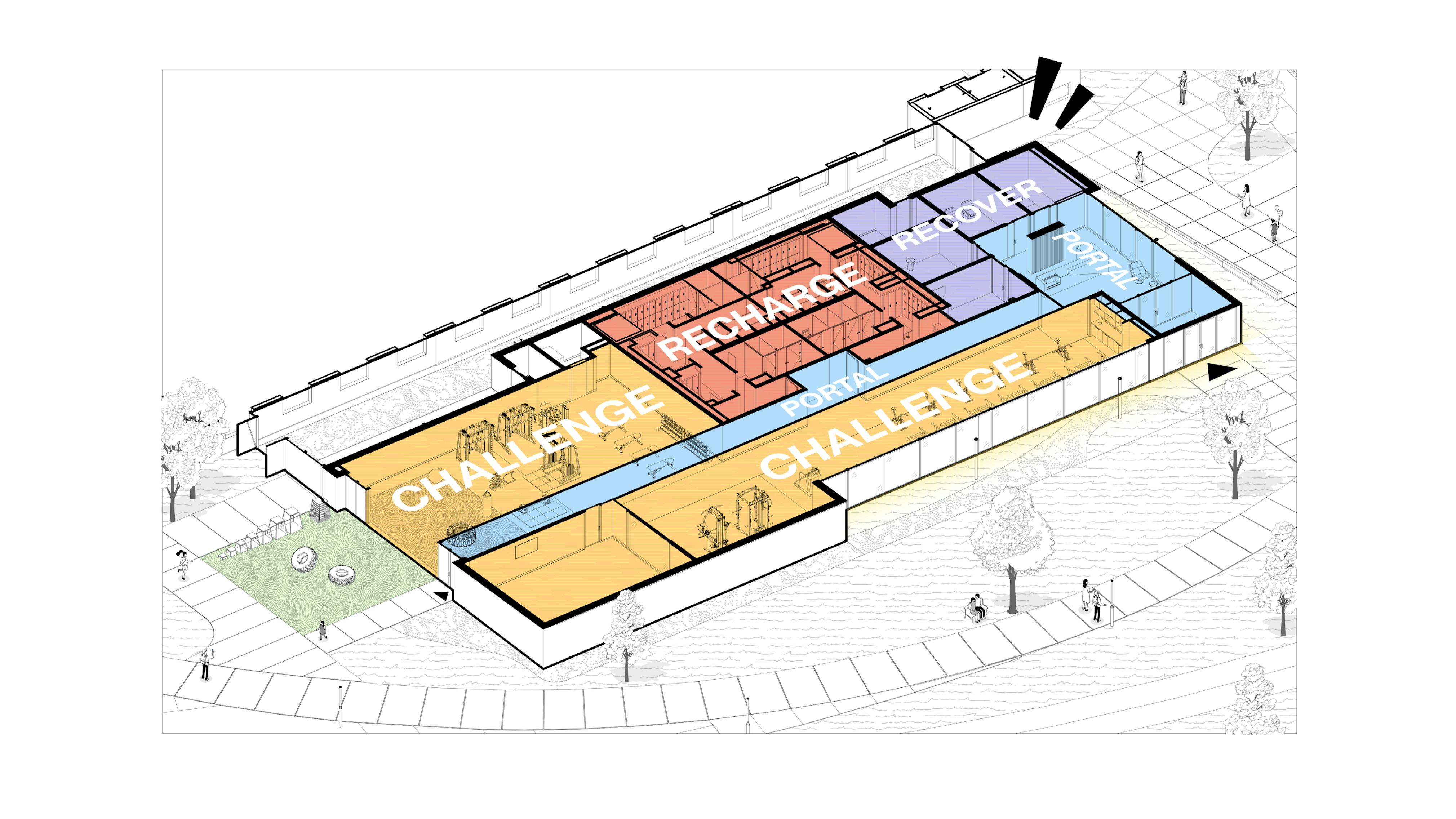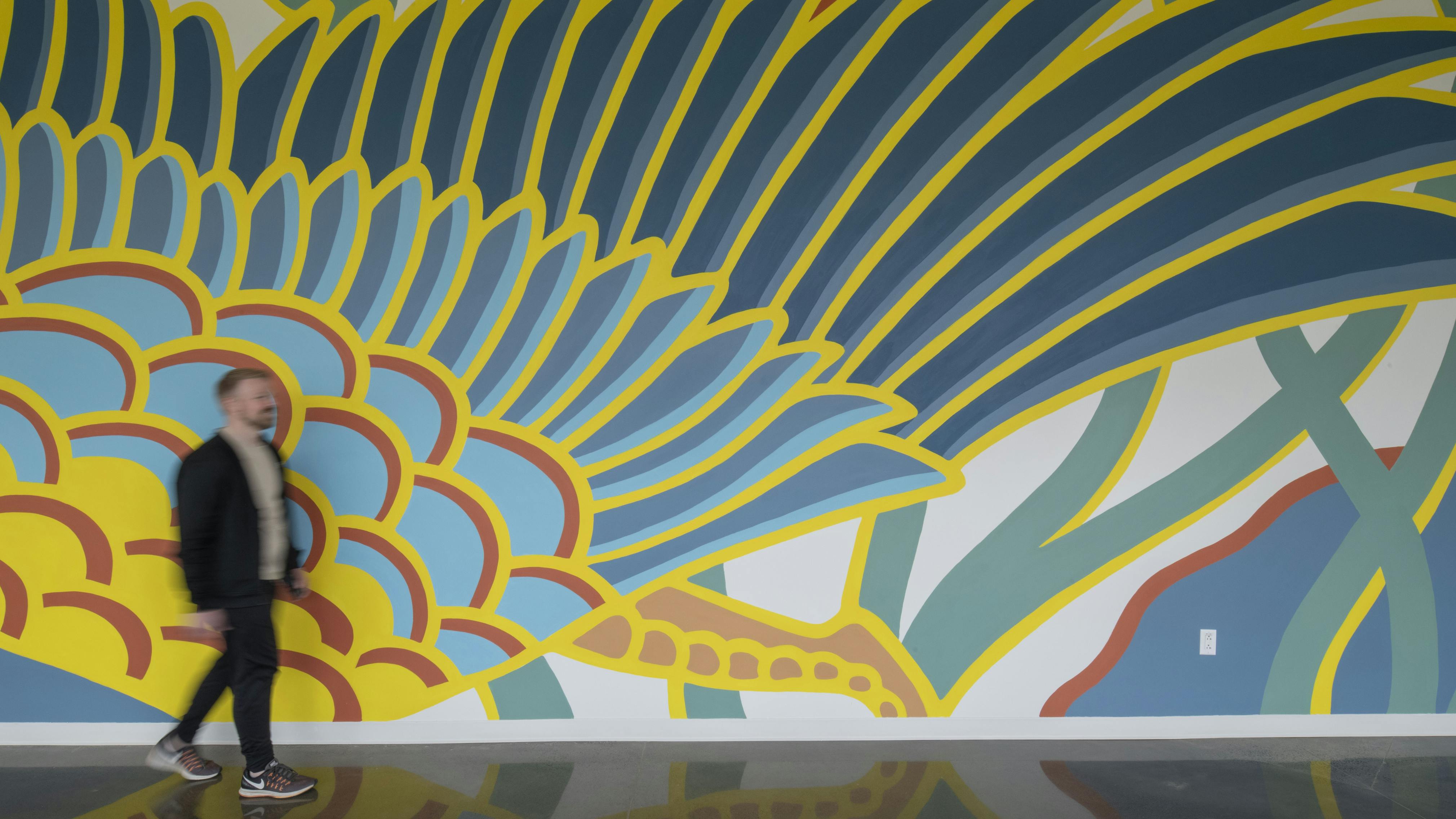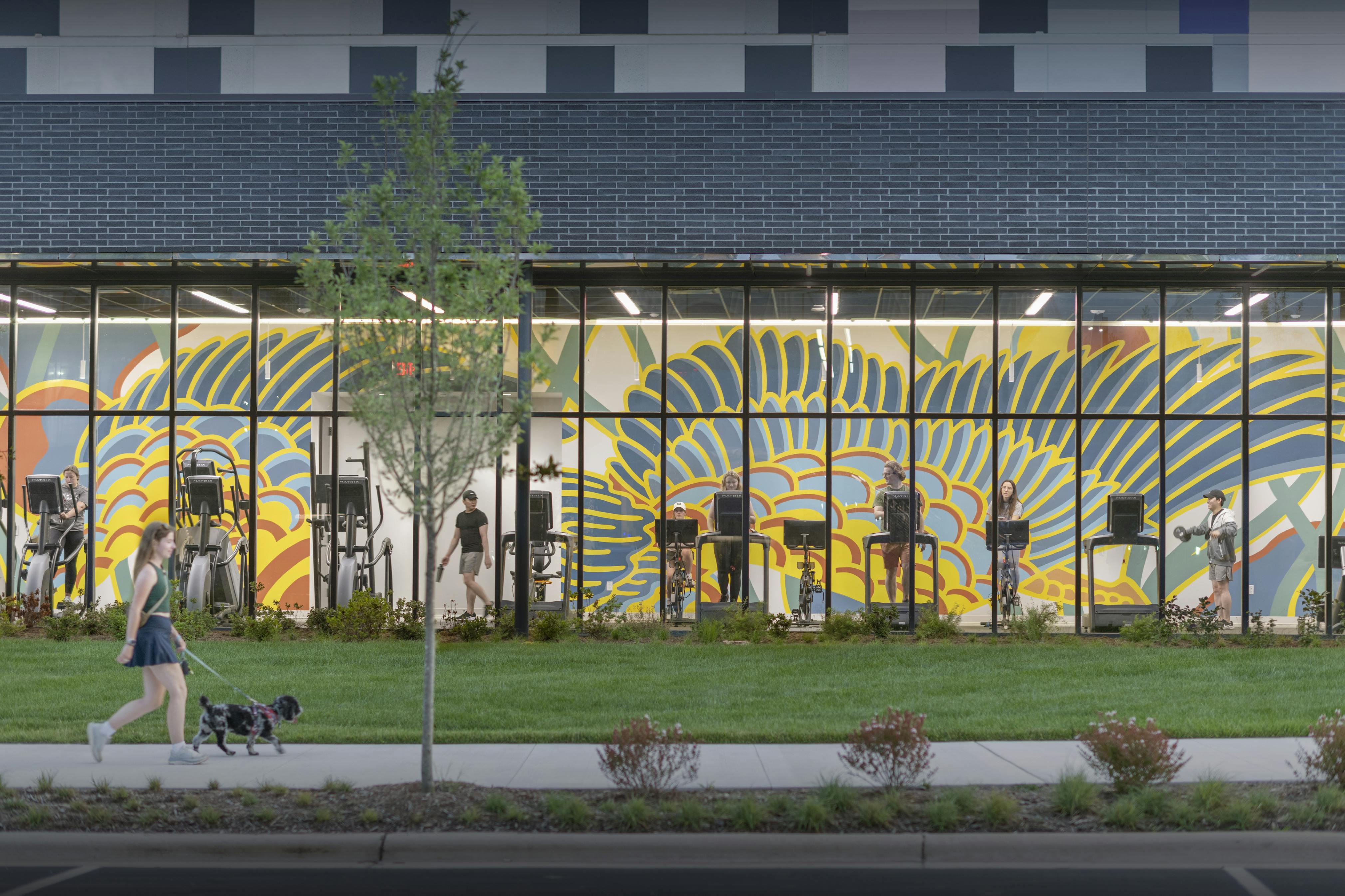 A mural spans the length of the facility, functioning as a visual spine and orientation device. Facing a transparent facade, the mural is visible from both interior workout zones and across the campus, establishing identity, directing flow, and registering movement within the building.