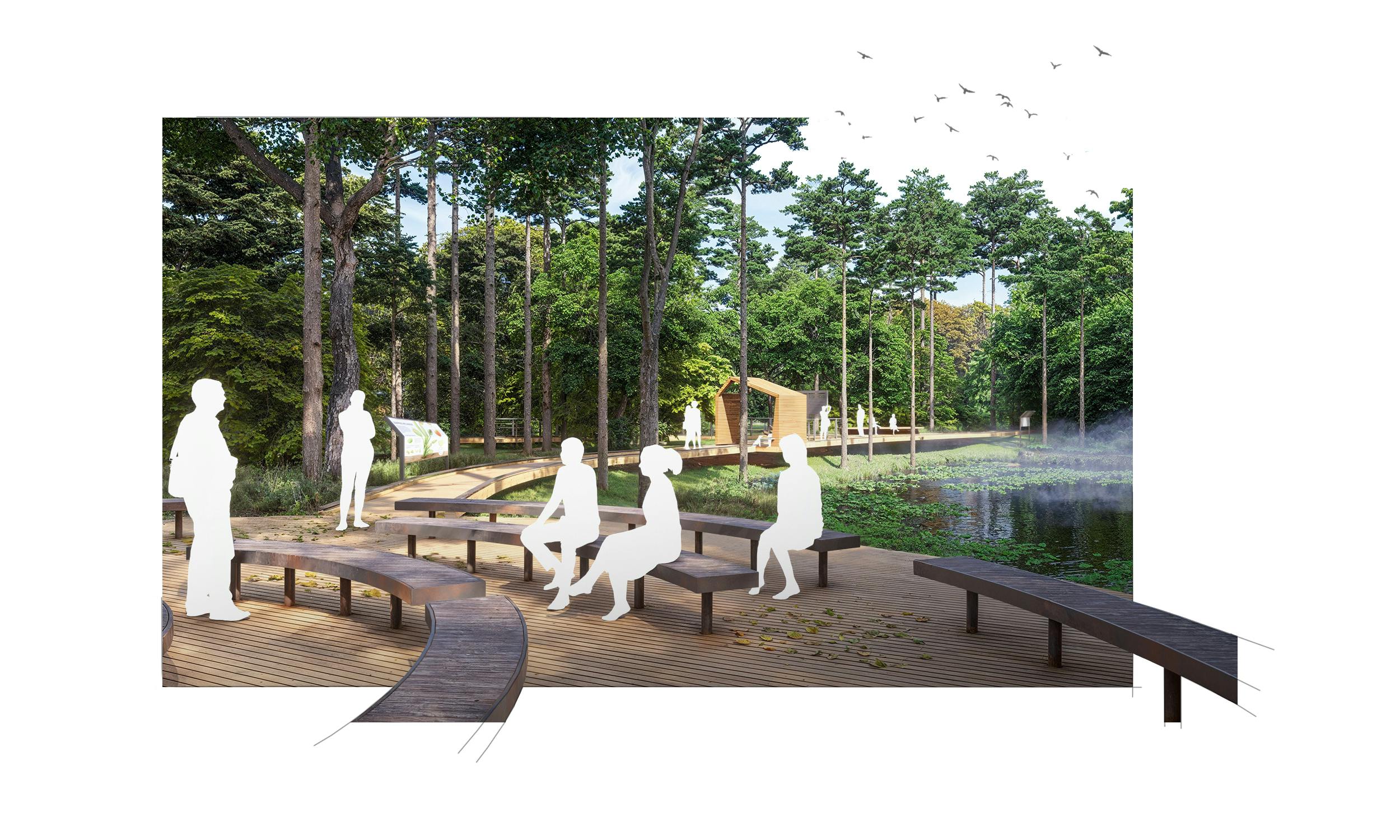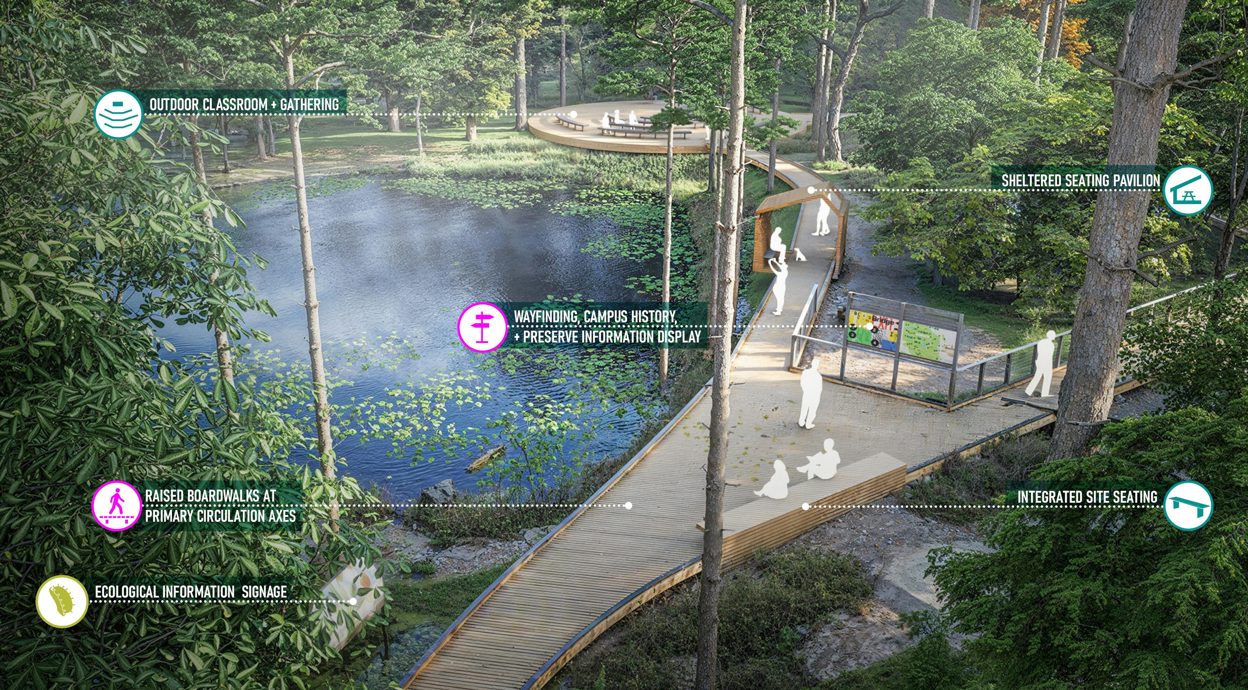 The thoughtful densification of the academic core along Chancellor’s Walk and the Campus Commons integrates new buildings alongside existing facilities, supporting growth while preserving a cohesive, pedestrian-oriented environment. Between these academic spaces, outdoor gathering areas, shaded seating, coastal-inspired art, and integrated educational features establish a network of social and contemplative places. Landscape interventions and visible stormwater management strategies reinforce the campus’s ecological resilience.