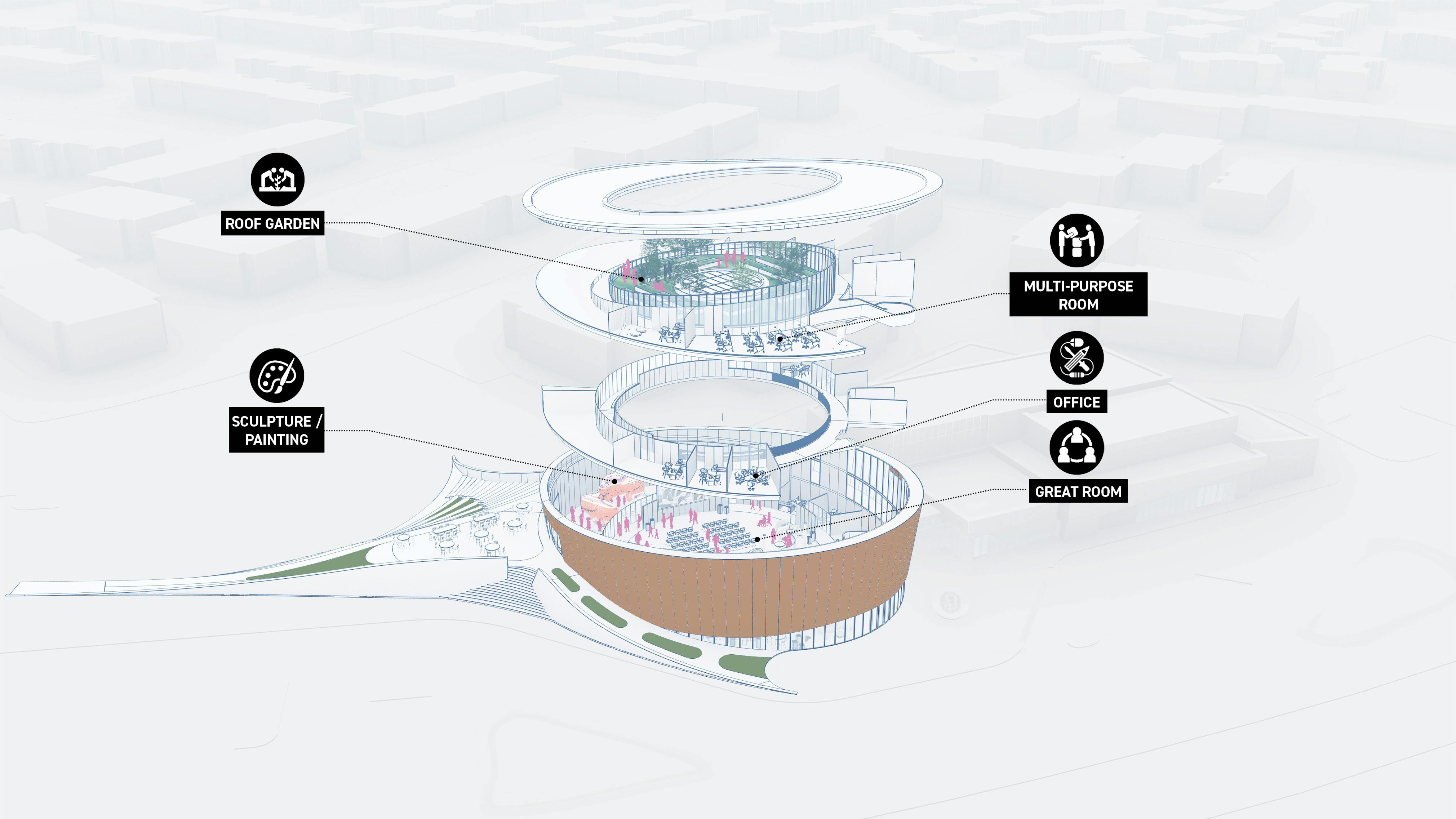 The building’s design follows the guiding formula of Co, Ed, Cu, representing community, education, and culture. Conceived as a dynamic and interactive space, it aims to provide the local community with versatile areas for gatherings, meetings, workshops, and educational activities, while also serving as a centerpiece venue for ceremonies and performances.